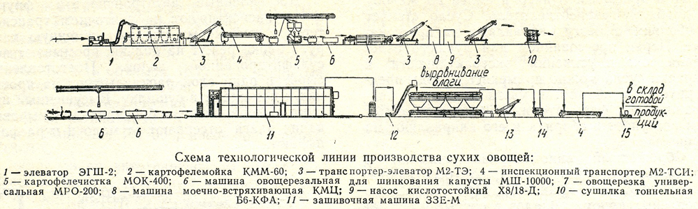 1 — элеватор ЭГШ-2; 2— картофелемойка КММ-60; 3 — транспортер-элеватор М2-ТЭ; 4 — инспекционный транспортер М2-ТСИ; 5 — картофелечистка МОК-400; 6 — машина овощерезальная для шинкования капусты МШ-10000; 7 — овощерезка универсальная МРО-200; 8 — машина моечно-встряхивающая КМЦ; 9 — насос кислотостойкий Х8/18-Д; 10 — сушилка тоннельная Б6-КФА; 11 — зашивочная машина ЗЗЕ-М.